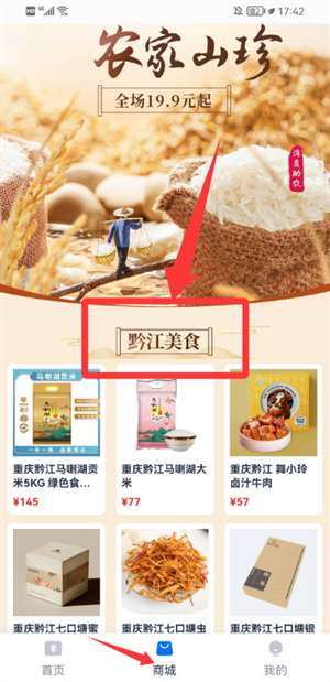 2、进入商城浏览黔江美食,查看该分类下商品。