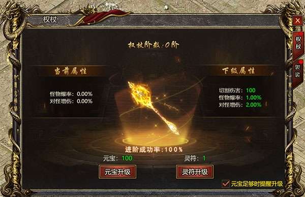 2、首先我们来介绍权杖法器,权杖阶数 一共分为20阶,主要攻击属性,有切割伤害加成,怪物爆率加成以及对怪增伤加成,升级权杖法器需要消耗一定的元宝,或者是消耗一定的灵符来进行升级,提升的阶数等级越高,进阶成功的概率会慢慢越低。