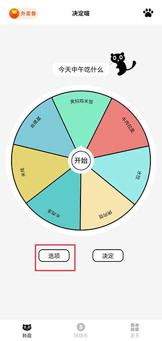 1、打开决定喵大转盘app,在转盘界面中点击选项