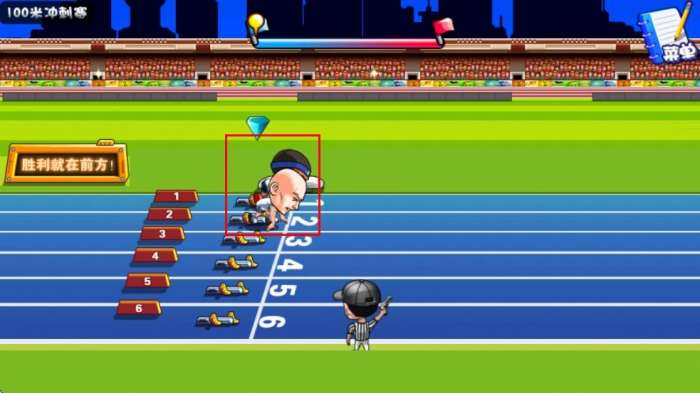 2、踏入跑道场景,操控头戴头带的运动员。待裁判发令后,借助点击或滑动屏幕的操作,掌控起跑与加速的节奏,向着100米终点全力冲刺。