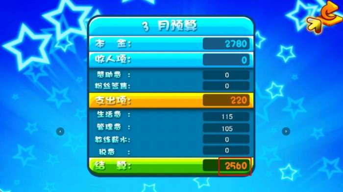 3、比赛结束后,打开3月预算界面,仔细核对本金以及各项收支,确认结算金额为2560。同时,对后续资金做出规划,将其用于训练、生活等方面的支出。