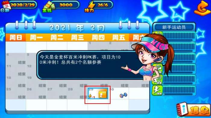 1. 在日历页面,点击2月29日金麦杯百米冲刺PK赛的图标,耗费1点体力报名参赛,确认获得参赛资格。