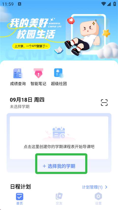 1、超级课程表手机版app,点击选择学期进行创建课表。