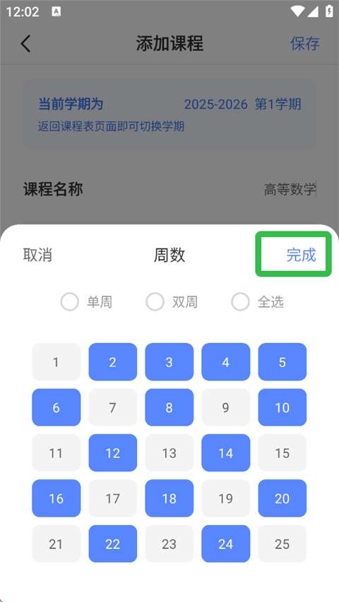 4、以手动添课为例,填写课程名称,选择上课周数。
