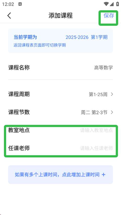 6、接下来填写教室地点可任课老师,点击【保存】即可。