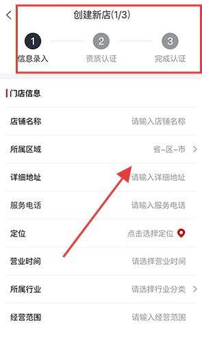 3、打开信用付掌柜APP进入创建新店页面,在信息录入环节,依次输入店铺名称所属区域等门店信息,按步骤推进新店创建。
