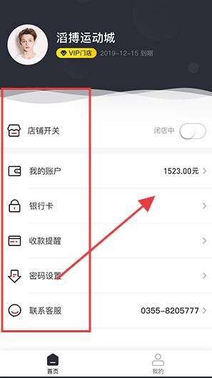 2、进入我的页面,可操作店铺开关查看我的账户余额,还能管理银行卡设置收款提醒修改密码或联系客服,保障店铺运营。