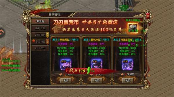5、开荒好礼、超值投资、月卡均为超长线收益并且提供大量居性,解放双手。