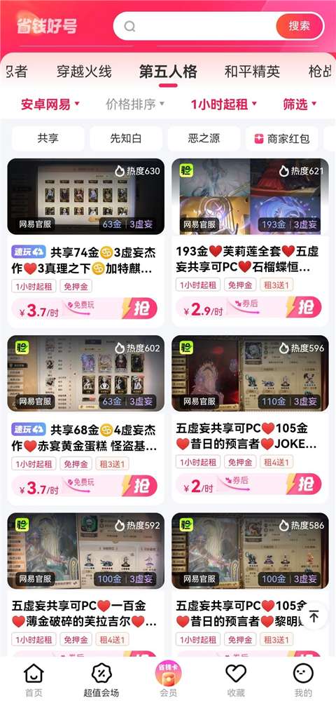 1、打开租号玩,进入【超值会场】界面,选择【省钱好号】还是【大神靓号】板块。