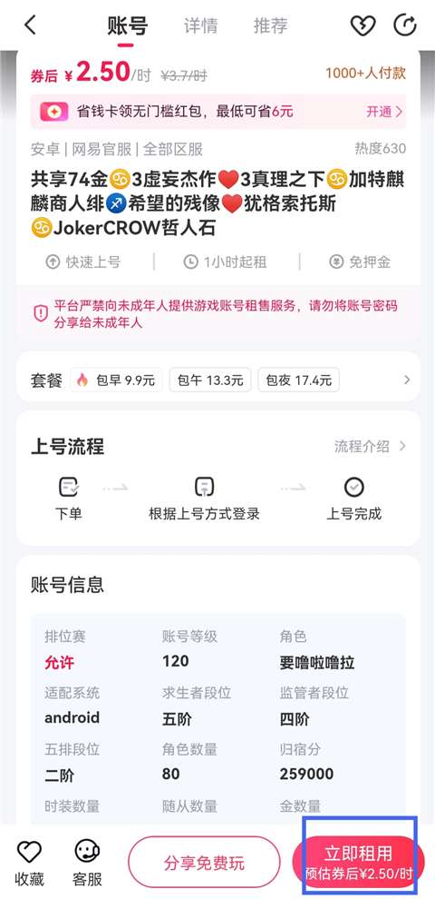 5、查看该账号详情界面,无误后点击【立即租用】。