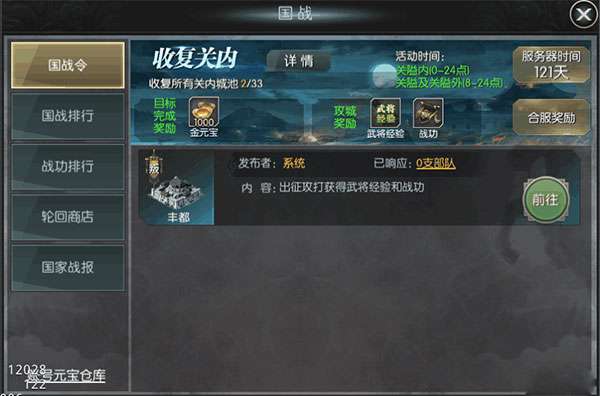 国战是主公快速提升战斗力的途径,因为通过国战系统可以完成国战任务从而获得大量的战功,战功可以拿去换取升星材料、宝石、招募令、强化道具,从而快速使自己变得强大起来,这样才可以一统天下。