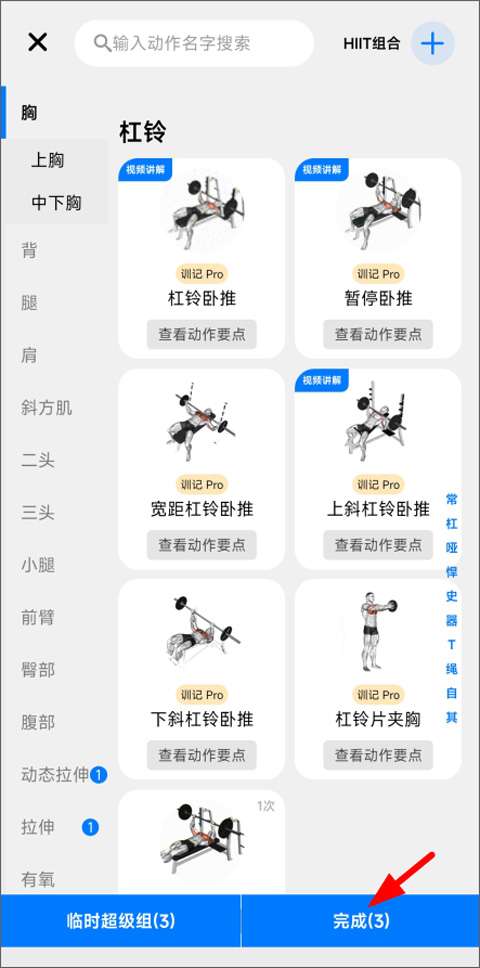 4、打开动作添加页面,用户可以根据自己的锻炼需求选择合适的锻炼动作,然后点击“完成”。