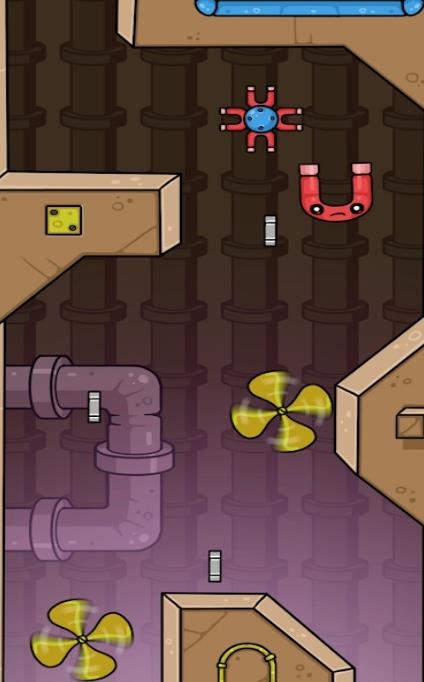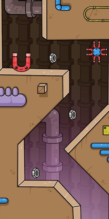1、玩家们控制红色磁铁在挑战场景,也就是不同的管道空间中进行障碍躲避过程中收集螺丝帽。