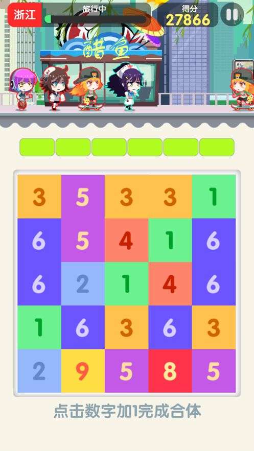 3、在这里界面会分为两部分,上面是在不同城市旅行的动画,下面则是玩家们要操作的数字合并板面。