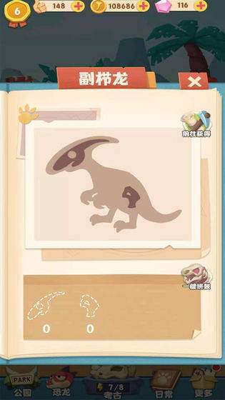 2、通过一些化石,你还能合成稀有的恐龙出来的哦,成功复活那些已经灭绝了的动物们;