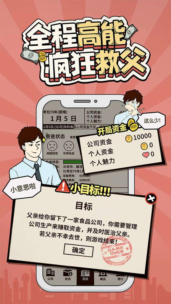 爸爸活下去是一款策略性模拟经营手游,玩家在游戏中是一个富三代,因为经济危机,你由原来挥金如土的日子变成了一个穷光蛋,而且还面临着巨额医药费,为了拯救重病的爸爸,你需要将仅剩下的唯一一家食品工厂经营好,凭借自己高超的经济头脑将这间食品工厂的规模扩大,获得更多的收益,去进行更多的投资吧。