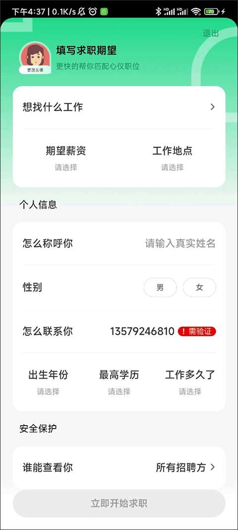 2、然后填写相应信息,单击立即开始求职。