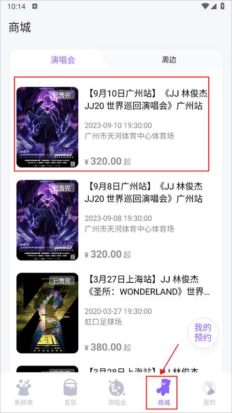 2、在商城界面中会显示近期的演唱会场次,若显示已售完代表该场次已经没票了,请等待下一场开售