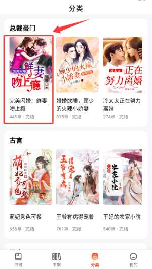2、在分类里面找到总裁豪门,在选择喜欢的书籍。