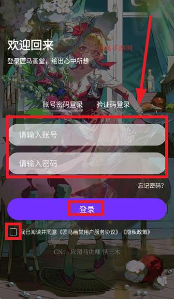 3、输入您的账户密码,勾选“我已阅读并同意《江马画堂用户服务协议》和《隐私政策》”,点击登录。