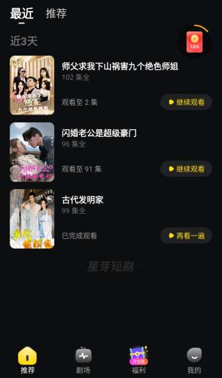 1、在星芽免费短剧app看了一部短剧后,软件中会留下一段观看历史,供以后观看。
