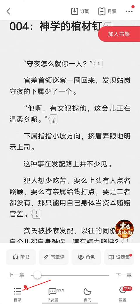 5、如果想看其他章节的内容,点击下屏幕任意位置,底部就会出现选项,点击左下角“目录”;