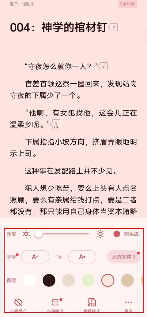 6、点击底部“设置”,还支持设置护眼模式、自动阅读、横屏模式、字体、背景等。