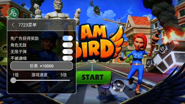2、然后能够调出想要的菜单,可以实现免广告、角色无敌、无限子弹等一系列效果,然后点击start按钮。