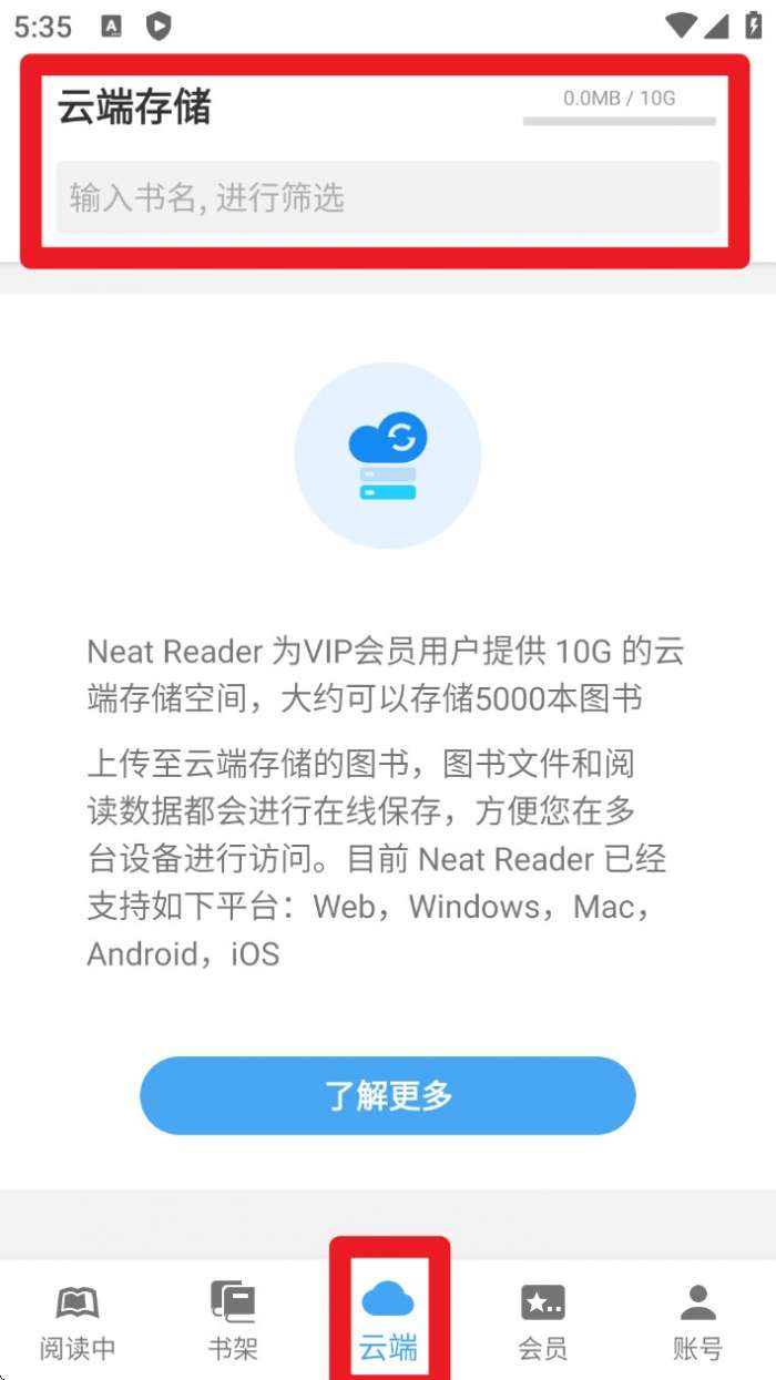 4、点击底部「云端」可进入云端存储界面,支持上传图书至云端,VIP用户可享有10G存储空间,方便多设备同步阅读。
