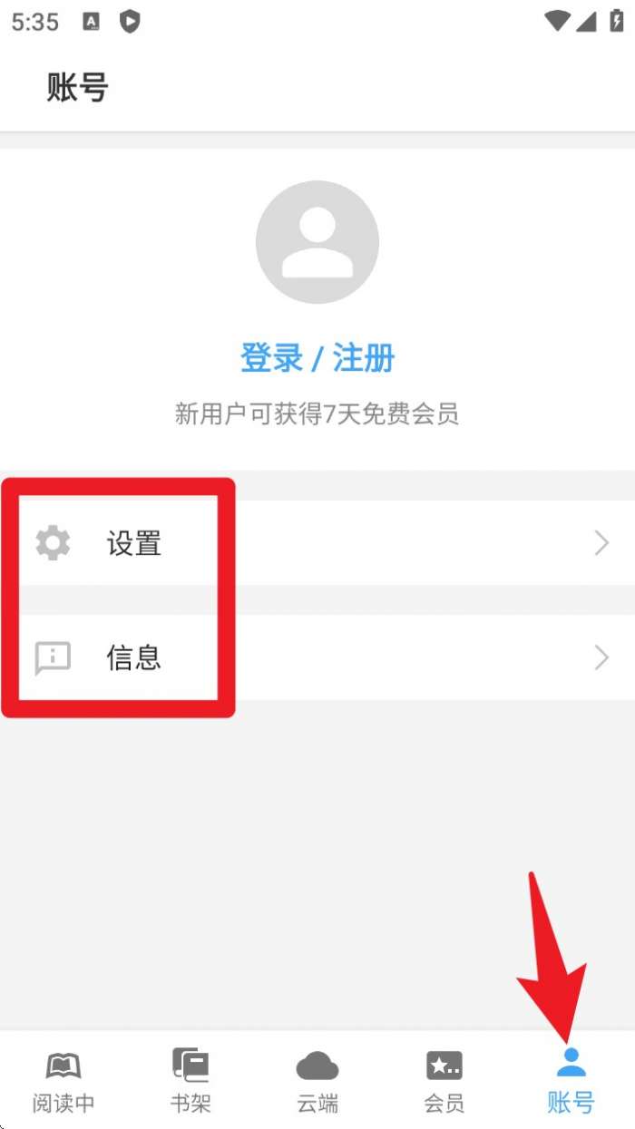 5、点击底部「账号」进入个人中心,可登录或注册账户,并在「设置」中调整应用相关配置,在「信息」中查看应用信息。