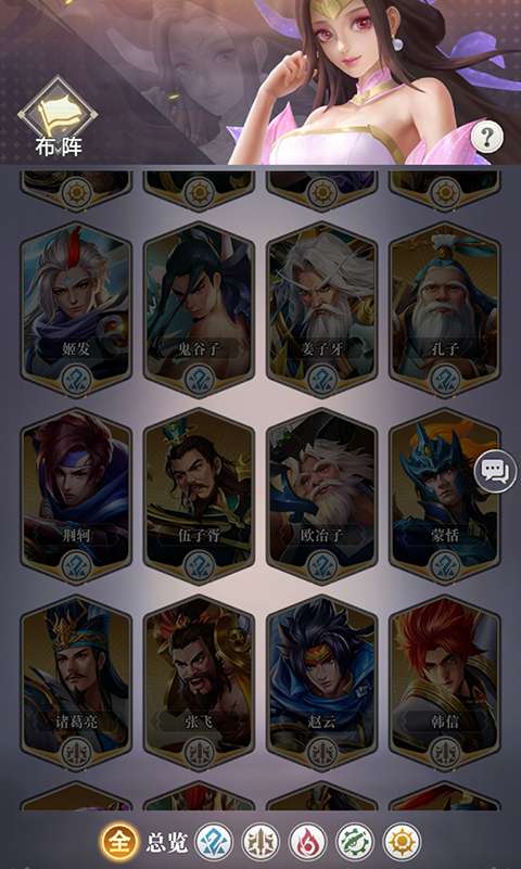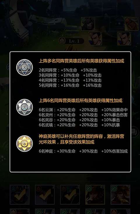 1、游戏内有着云渊、武境,灵州,岚谷,神庭五大阵营英雄,还分为攻、突、防、辅四种职业类型。