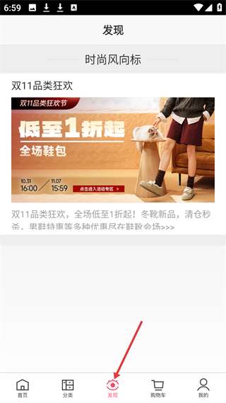 3、发现展示双11活动,呈现时尚风向标内容,提供潮流资讯和优惠信息,引导用户参与购物活动。
