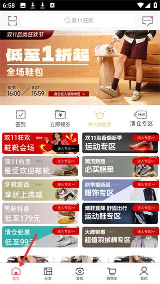 1、首页推双11鞋包低至1折活动,设签到、领券等入口,还有鞋靴、运动等专区,方便用户选购商品。