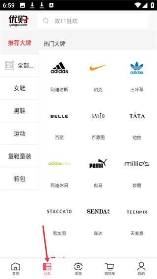 2、分类涵盖多品类,推荐阿迪达斯、耐克等大牌,分类清晰,助力用户快速找心仪品牌品类。