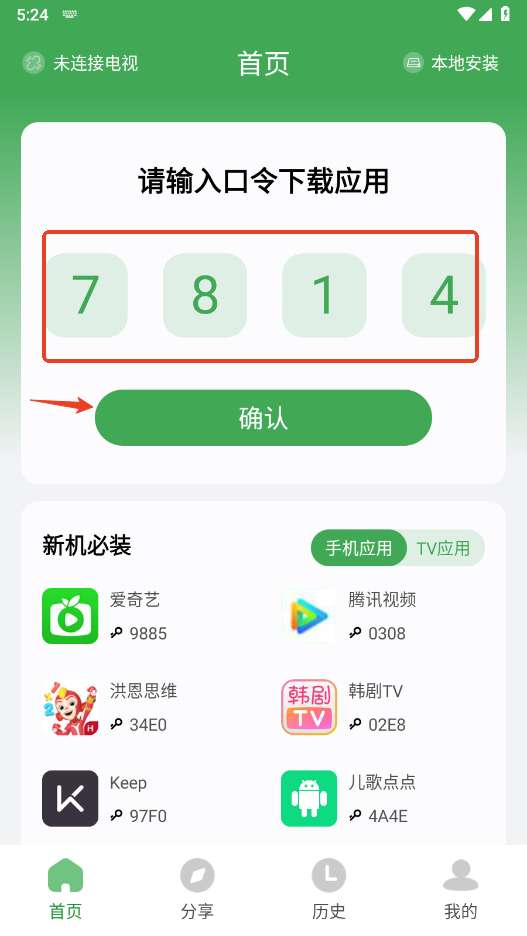 1、首先电视和手机上都安装了对应的软件,然后打开手机上的app输入口令。