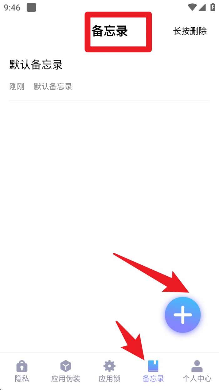 4、使用「备忘录」功能可创建隐私笔记,点击右下角「+」号即可新增记录,便于管理。