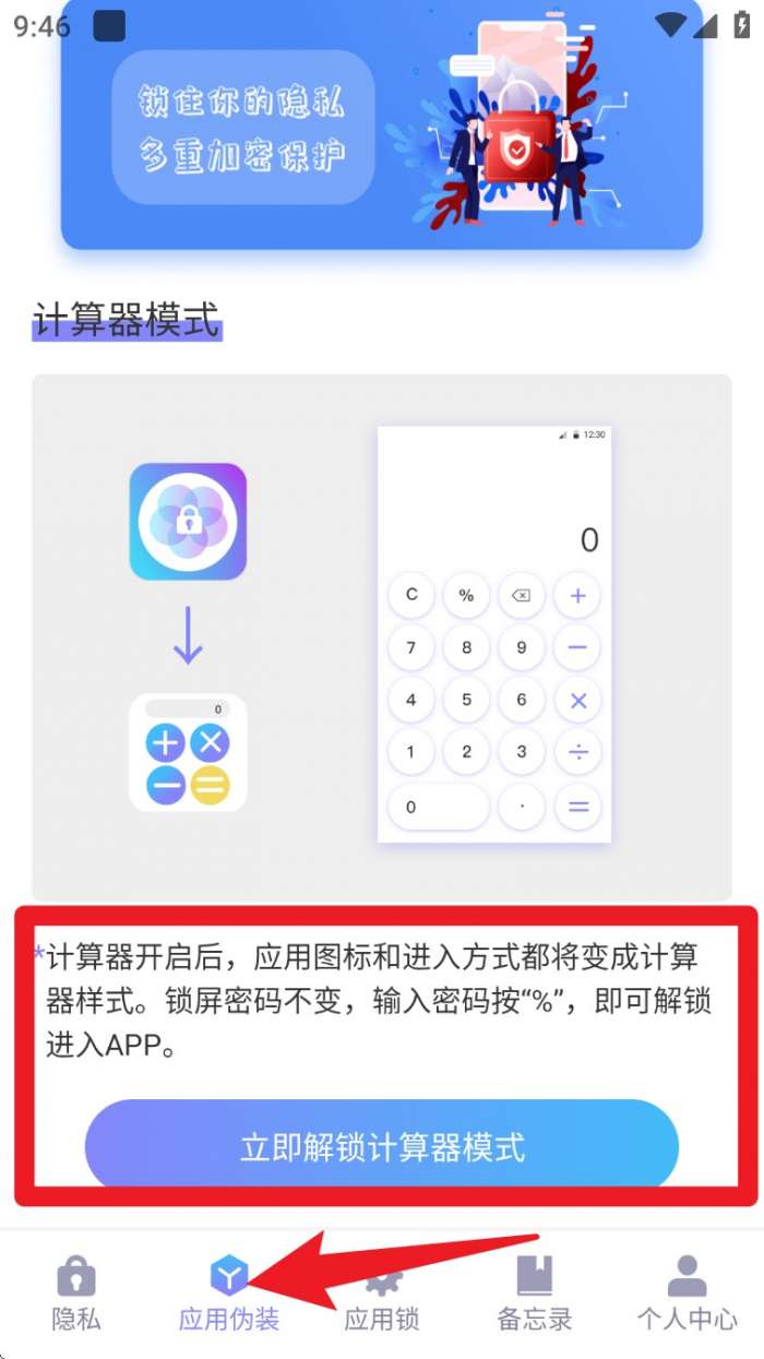 3、切换到「应用伪装」功能,将 App 图标伪装成计算器,输入密码再按「%」即可解锁。