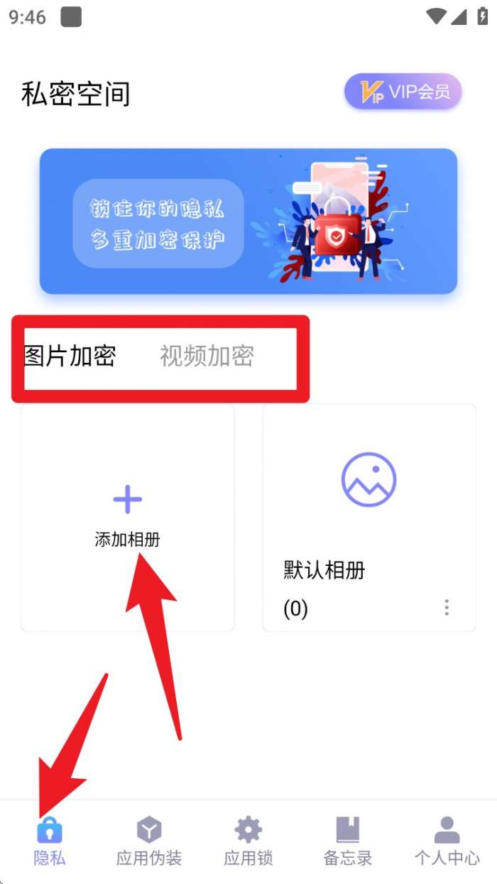 2、进入底部菜单「隐私」页签,点击「添加相册」可将想要隐藏的图片加密储存。