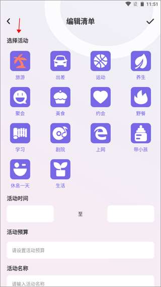 2、选择您的活动类型、活动时间、包装项目等,然后单击右上角的挂钩图标。