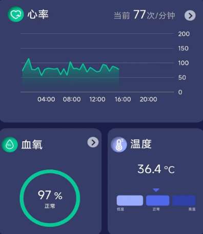 1、综合健康数据显示:软件实时记录和显示步数、睡眠、心率、消耗量、心电图和血氧等关键身体状态数据。