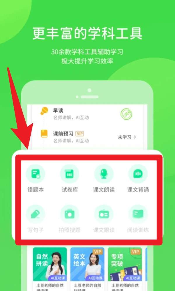 5. 切换至学科工具区,可使用错题本、试卷库、课文朗读、拍照搜题等功能辅助学习提升效率。