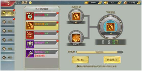 拿到好的装备,这还只是你提升装备品质的第一步,第二步,就是把你获得的装备进行加强啦!使用铜钱对装备进行锻造,为装备进行宝石镶嵌,每天打BOSS(BOSS:没错又是我)收集套装石,为装备进行套装锻造。把这些都完成了,你会发现你的装备已经能羡煞旁人了。