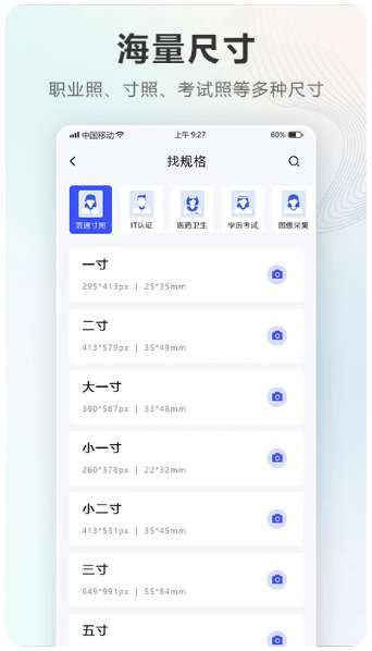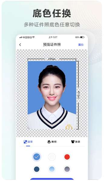 4、【多种尺寸】 一寸证件照、学生证件照、工作证件照都可以用手机随时随地制作!一键改变证件照的底色,可以选择多种背景色。