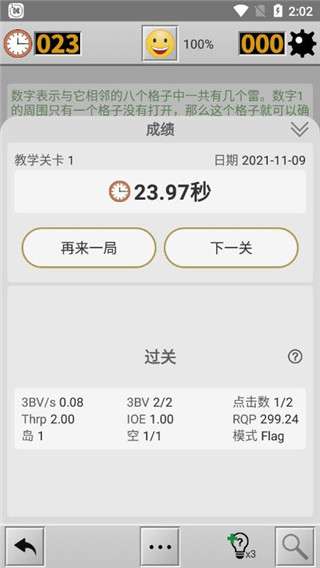 3、双击:直接点击屏幕完成双击。当双击位置周围已标记雷数等于该位置数字时操作有效,相当于对该数字周围未打开的方块均进行一次左键单击操作。地雷未标记完全时使用双击无效。若数字周围有标错的地雷,则游戏结束,标错的地雷上会显示一个。