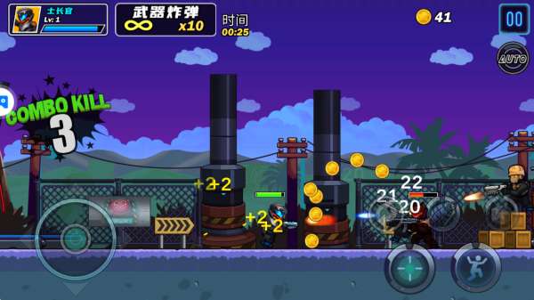 3、左侧轮盘操控角色移动,右侧操控射击以及跳跃,更有手雷等多种道具以及技能释放。