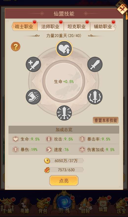 仙盟技能系统内可以提升4个英雄职业的基础属性加成,只需用金币和仙盟贡献材料升级技能即可,即使退出了仙盟也会仙盟技能在新仙盟也会继续生效哦~