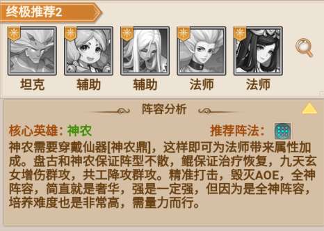 特点:全神阵容,神农(带仙器 “神农鼎”)为法师加属性,盘古承伤、鲲鹏治疗,输出以法师 AOE 为主,强度极高但培养难度大,需大量资源支撑。