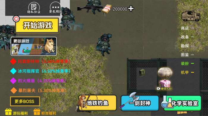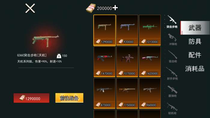 2、点击屏幕右侧的商店按钮可以打开游戏商店,这里有各种枪械以及防具和配件可以购买。
