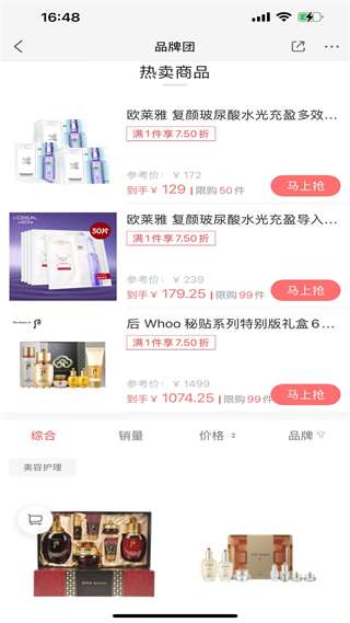 4、品牌团页展示热卖商品,有欧莱雅、后等品牌,含商品折扣和限购信息,方便用户查看和选购品牌商品。