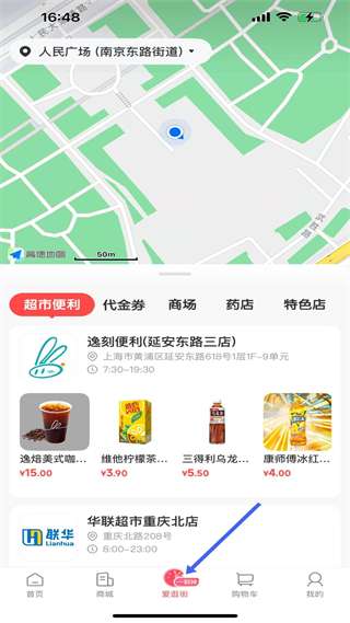 3、爱逛街页有地图定位和多类店铺入口,展示超市便利等店铺及商品,助力用户查看周边店铺和商品。